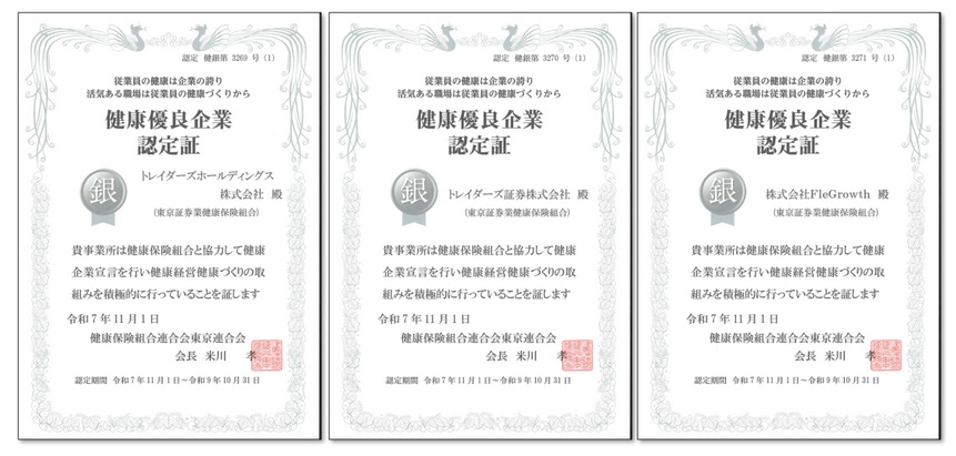 トレイダーズ証券グループ3社(トレイダーズホールディングス株式会社、トレイダーズ証券株式会社、株式会社FleGrowth)は、健康経営・健康づくりの取り組みを積極的に行っている企業として、健康保険組合連合会東京連合会より2025年11月1日付で健康優良企業「銀の認定」を取得しました。